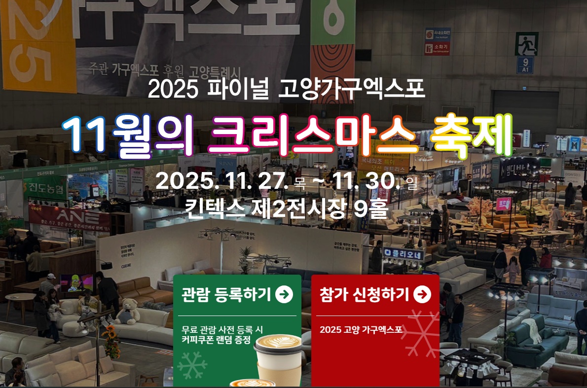 2025 고양 가구엑스포가 4월에 개막합니다! 국내 최대 규모 가구 전시회에서 최대 70% 할인 혜택을 놓치지 마세요. 지금 바로 온라인 사전등록하면 입장료 무료 혜택까지 받을 수 있습니다.
